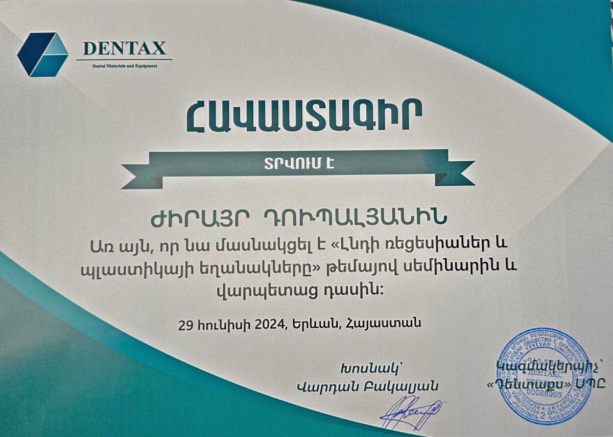 - 2012-2015 — College of Yerevan State Medical University after Mkhitar Heratsi, specialty «dental engineering»